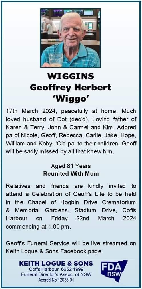Funeral location: the Chapel of Hogbin Drive Crematorium & Memorial Gardens, Stadium Drive, Coffs Harbour, NSW