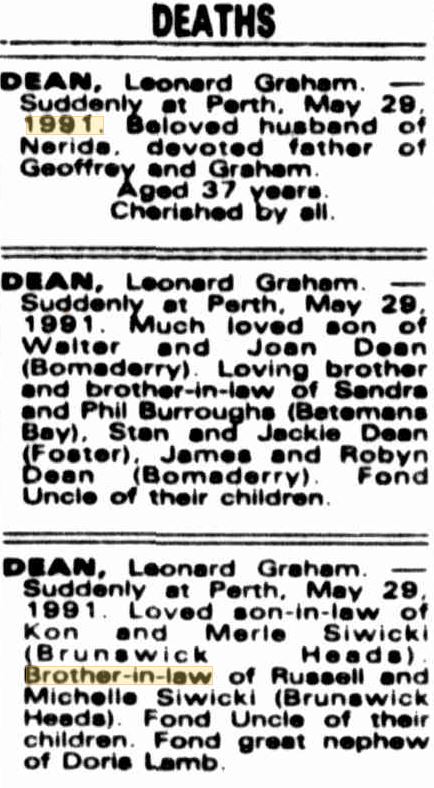 | DEAN | Leonard Graham | Funeral notice | 29MAY1991 | Death | 37 | at Perth | Northern Star (Lismore) | 31MAY1991 | |
