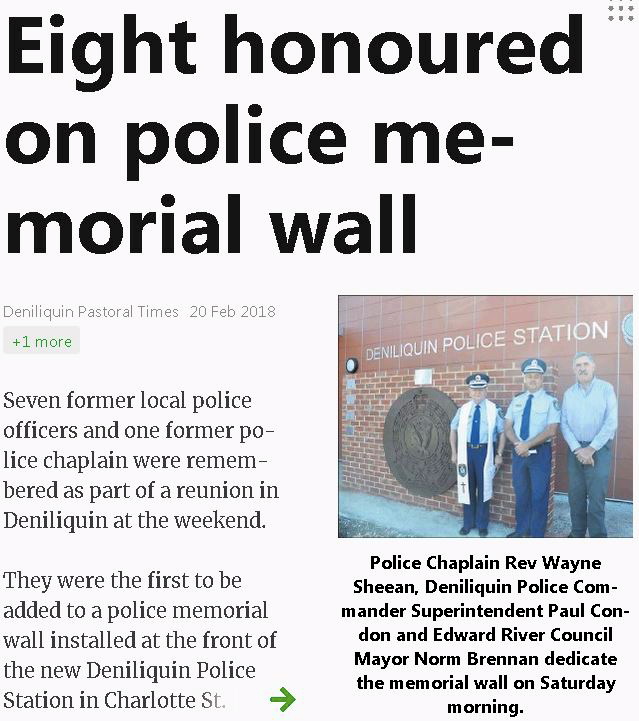 2/1/2019, Deniliquin Times. Eight honoured on police memorial wall’ –