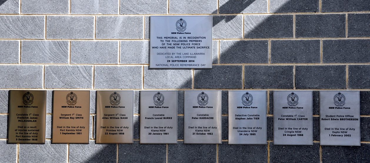Memorial location: External Wall leading into Lake Illawarra Police Station and photo, on wall, inside Lake Illawarra Police Station