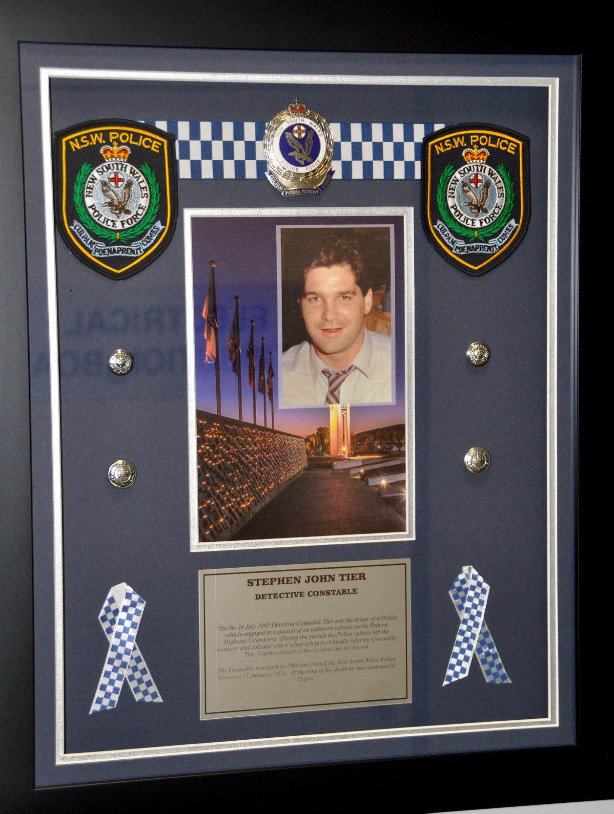 On 24 July, 1985 Detective Constable Tier was the driver, and single occupant, of an unmarked police vehicle engaged in the pursuit of an unknown vehicle on the Princes Highway, Unanderra. During the pursuit the police vehicle left the roadway and collided with a telegraph pole.